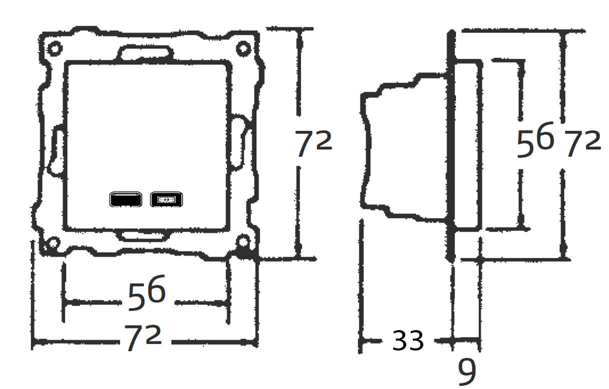 Levereras utan ram för infällt montage i apparatdosa eller för utanpåliggande montage i förhöjningsram eller hörnbox.